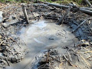 In visual terms, Chongde's volcano is less exciting than the better-known eruption at Wushanding (烏山頂) about 9km to the south. There's no cone as such, rather a 1m-wide belching hole in the ground. I picked up a bamboo almost as long as I am tall and stirred the hole. This seemed to cause an outbreak of bubbling; the stick wasn't long enough to probe the bottom of the vent, pictured below.